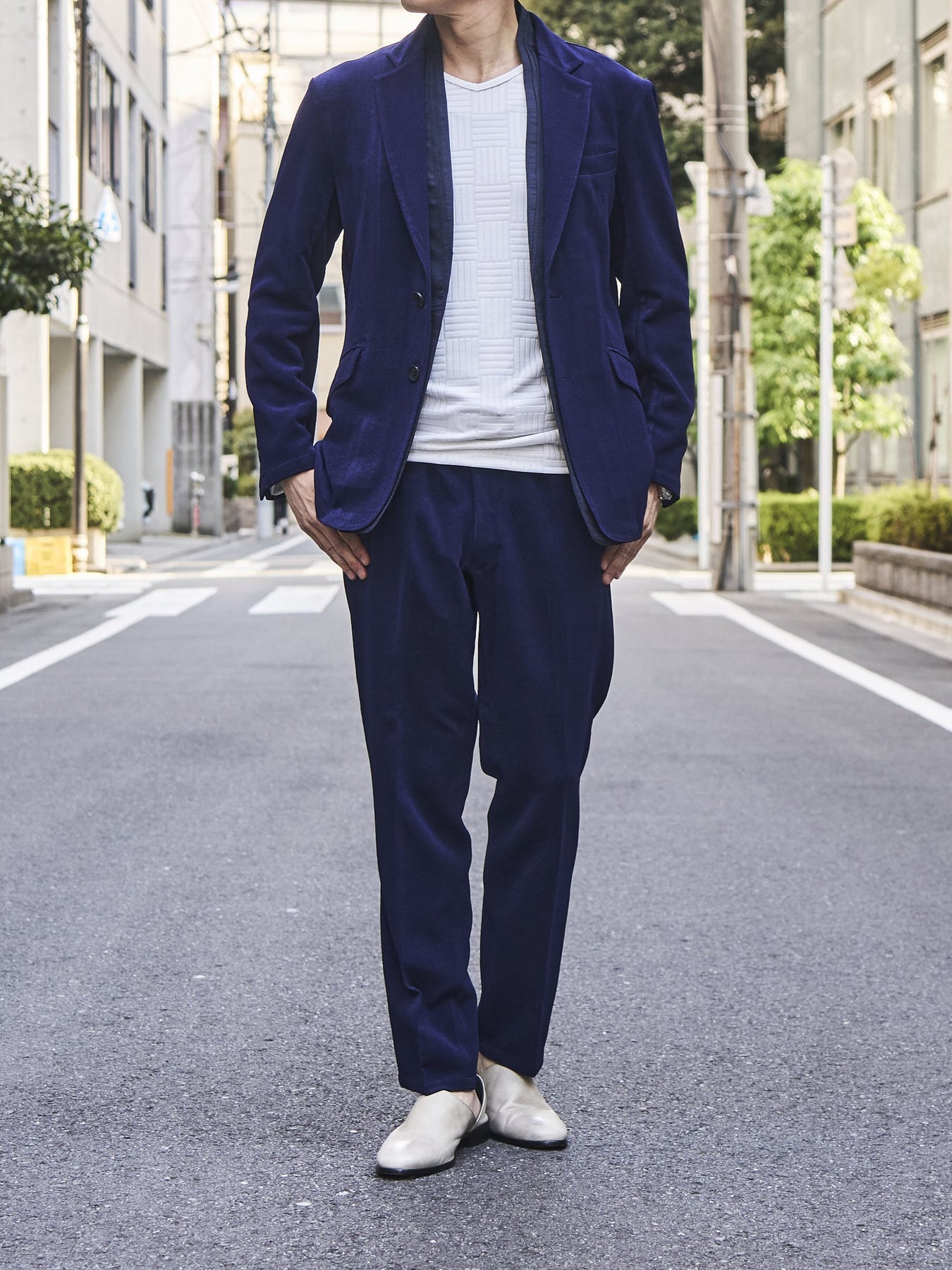 ・ シャツ+スラックスでスマートなジャケットスタイルに