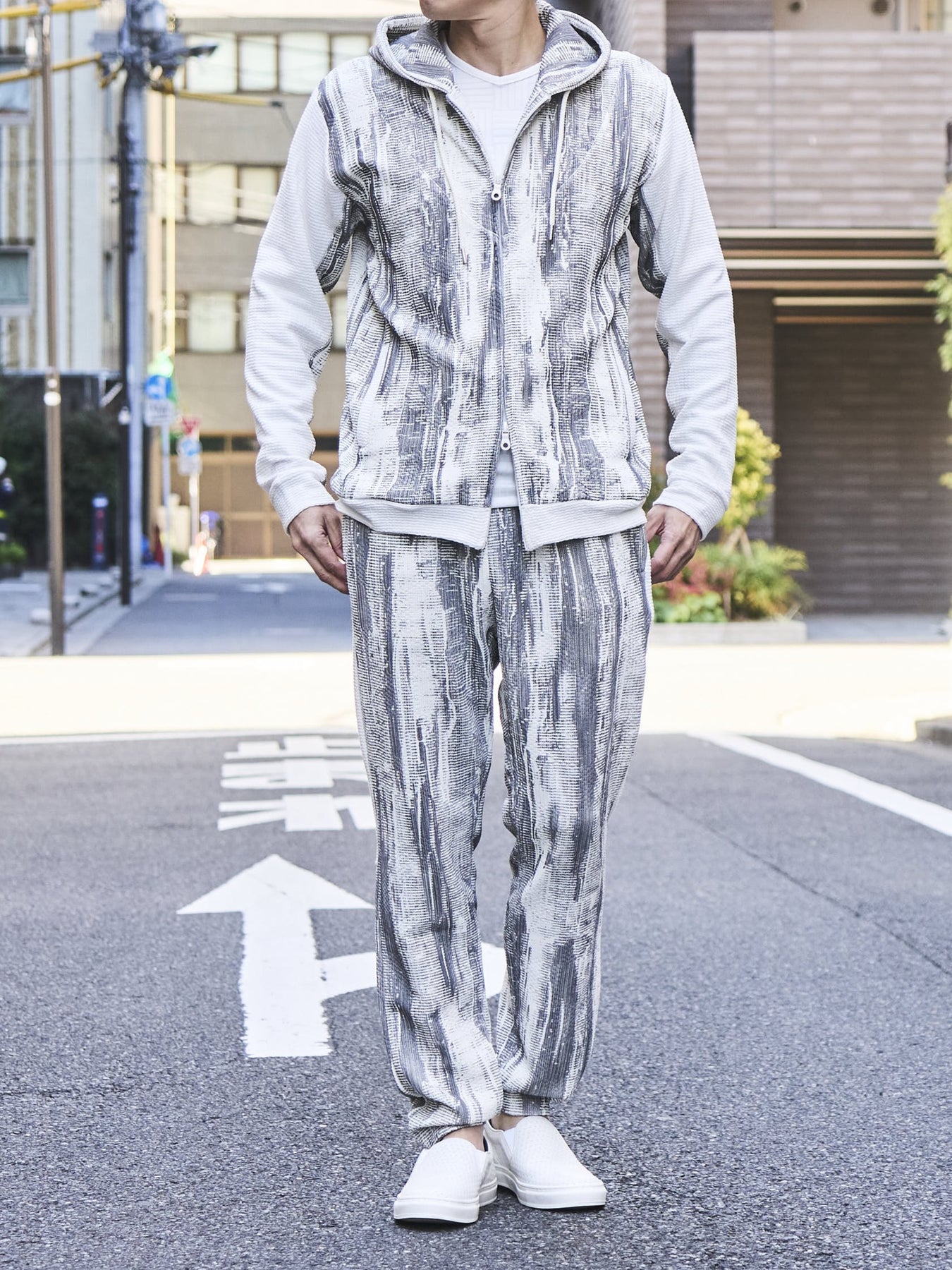 ・同素材のパーカーと合わせて、セットアップスタイルに