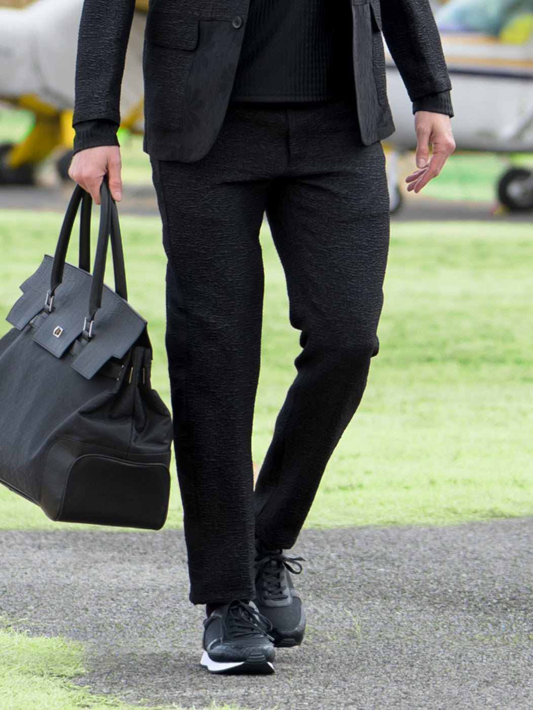 ブラック一色でありながら、素材のコントラストによって存在感を際立たせています。