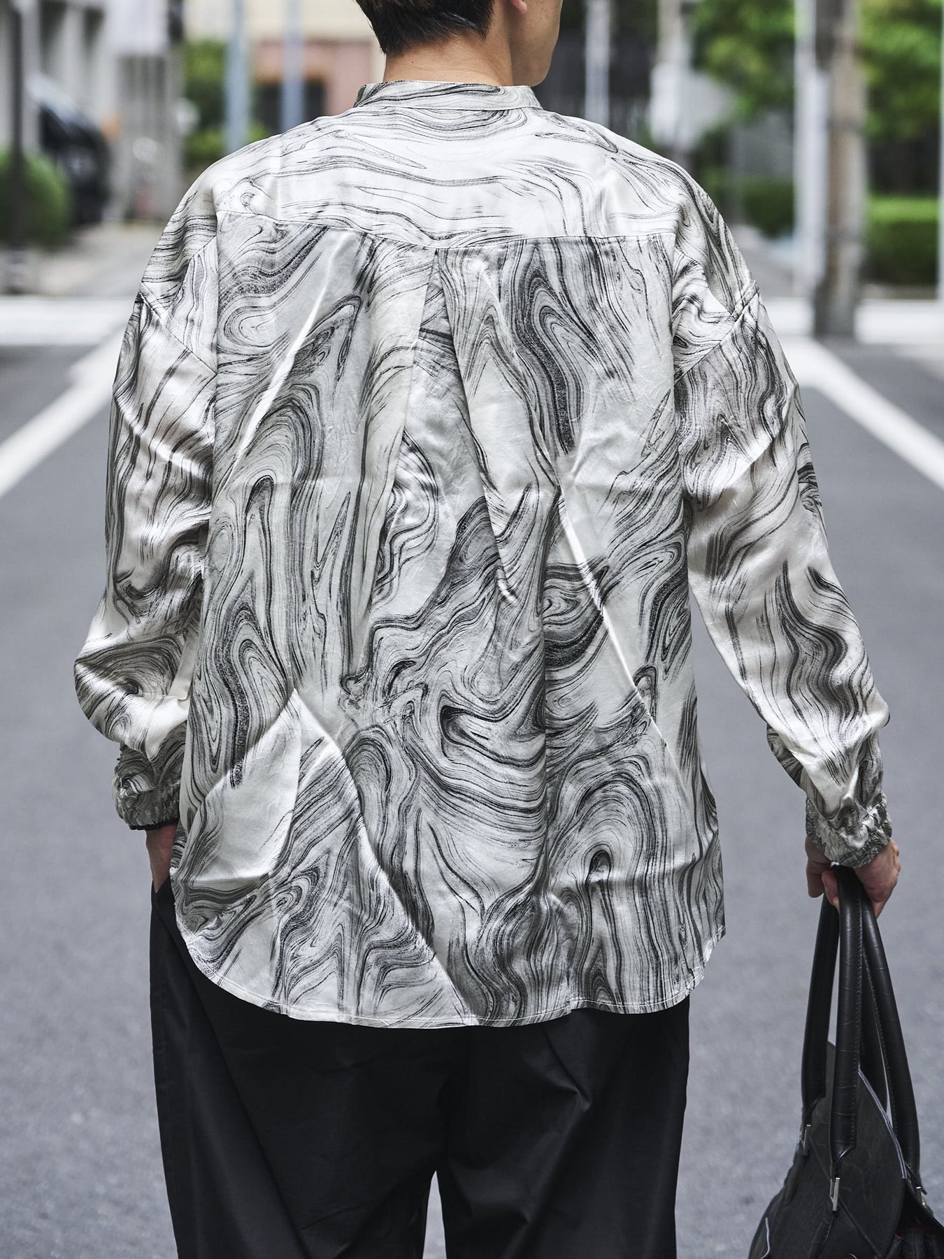 Regular price ¥20,900 - Pointsマーブルプリント素材を採用したバンドカラーシャツは、カフスがシャーリング仕様になっており。伸縮性抜群で肌触りの良い素材。