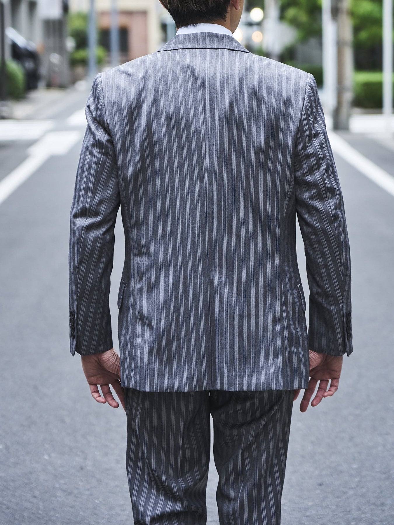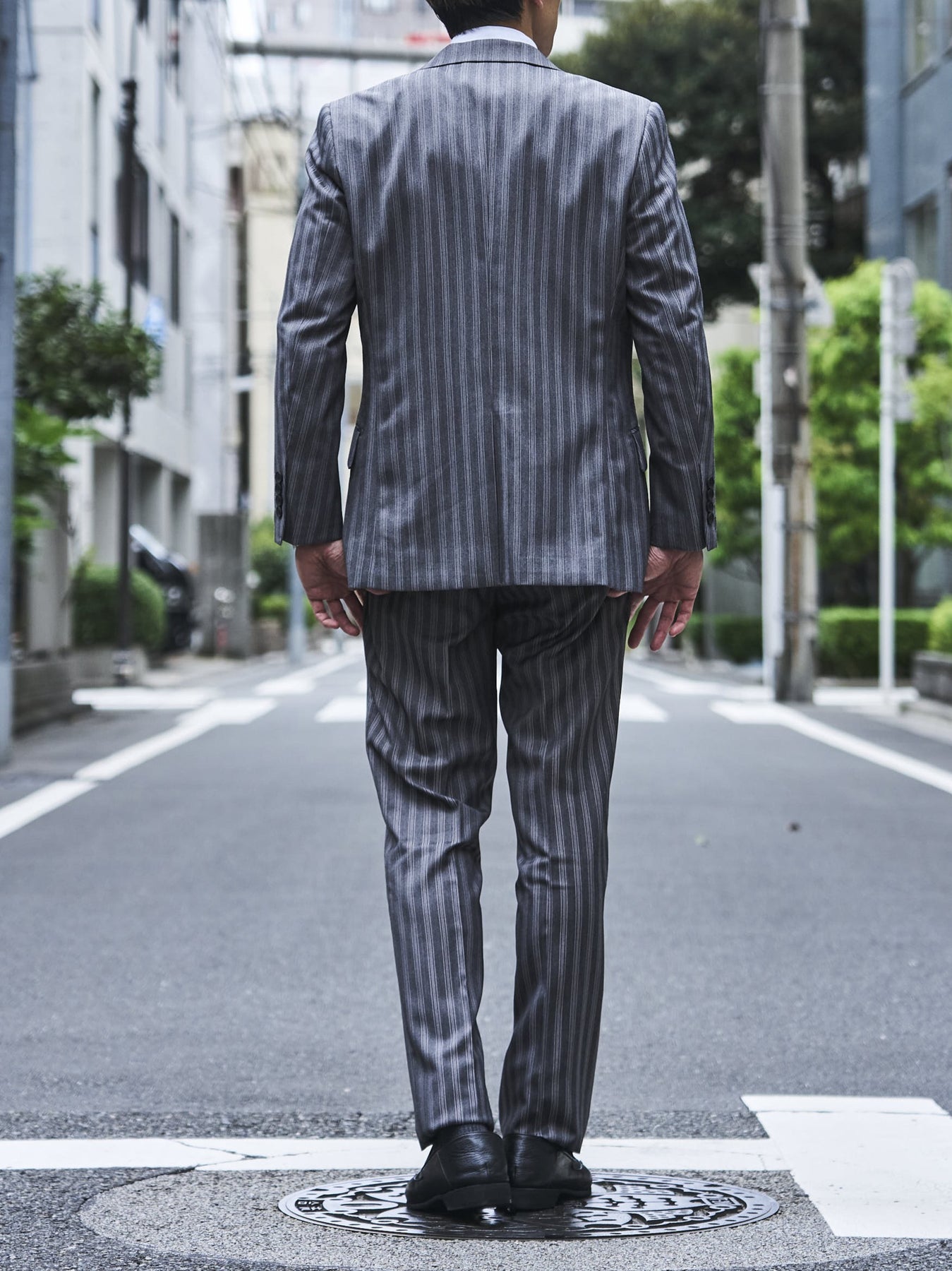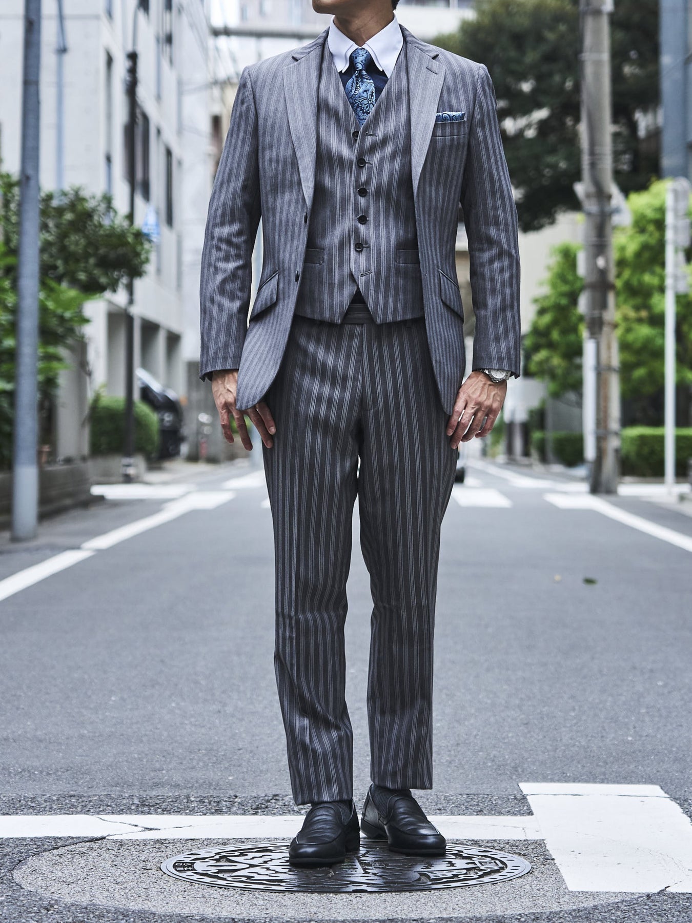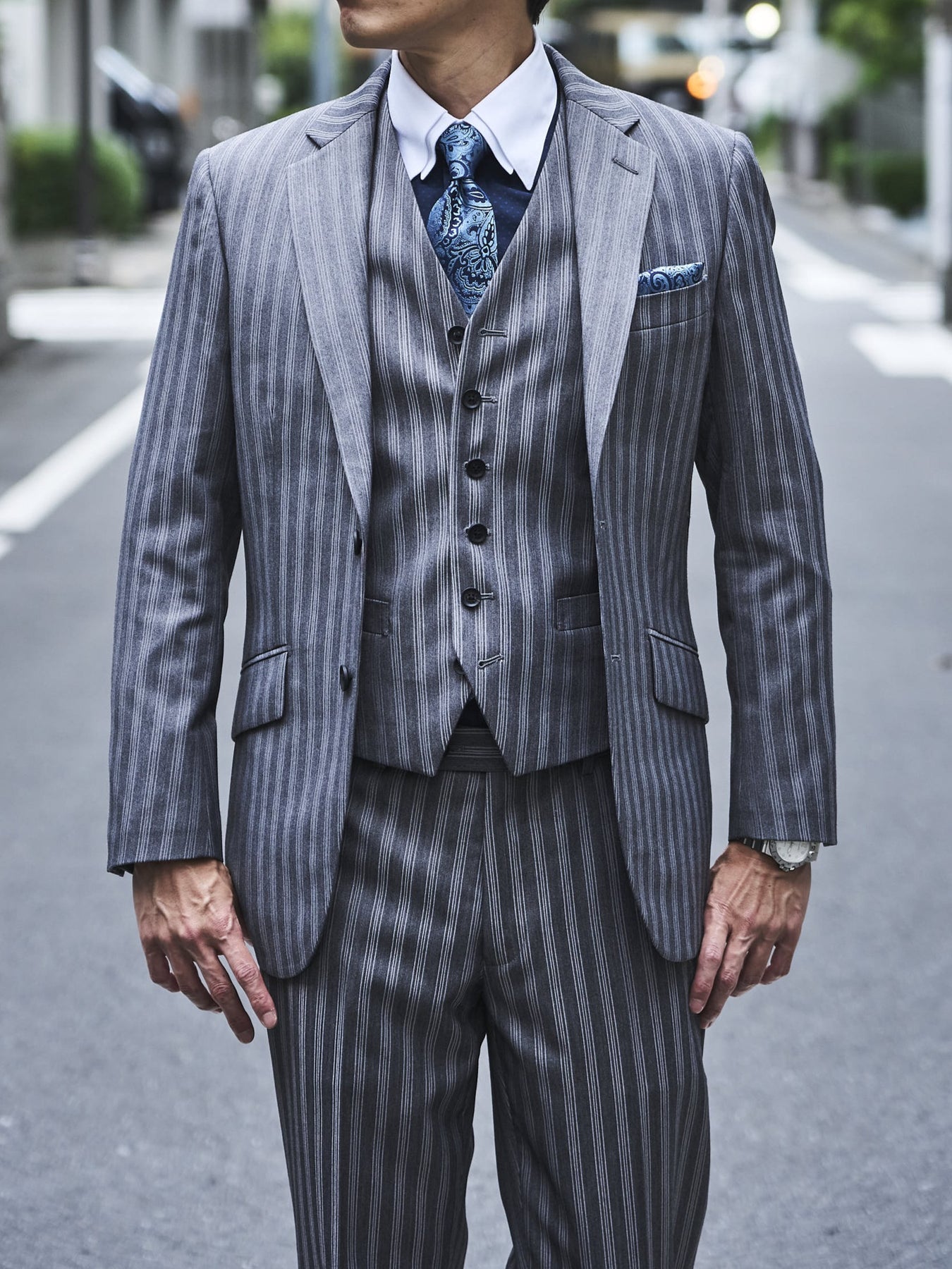 微光沢ストライプ柄を採用したスリーピーススーツは、ビジネスシーンで使い易い3色展開。