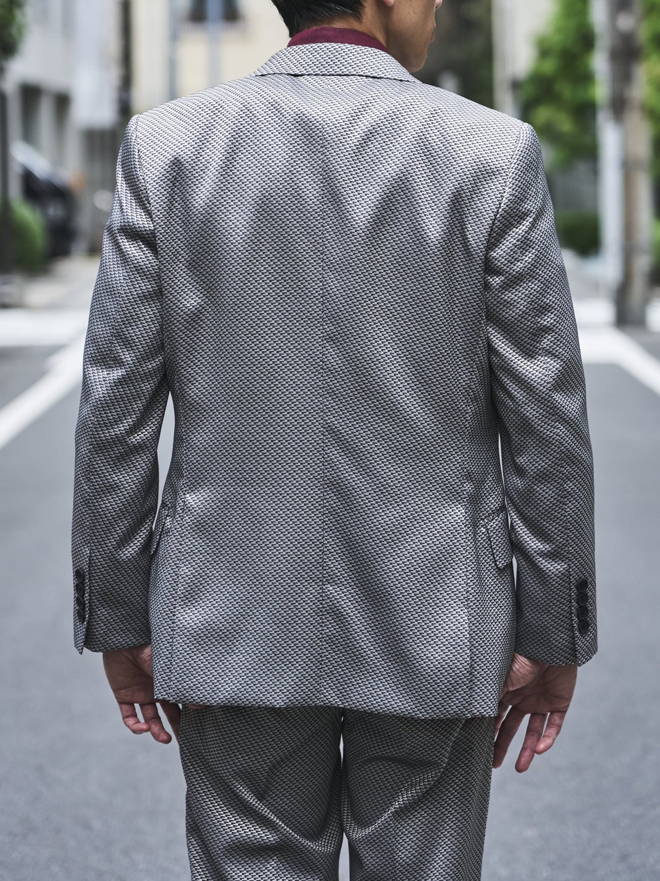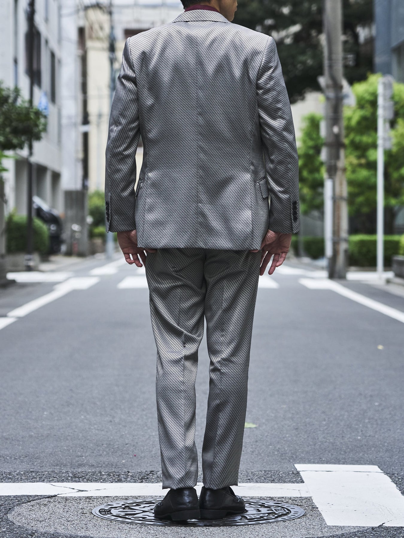 照り返しの強い光沢素材を採用したスリーピーススーツは、ビジネスやパーティーシーンで活躍します。
