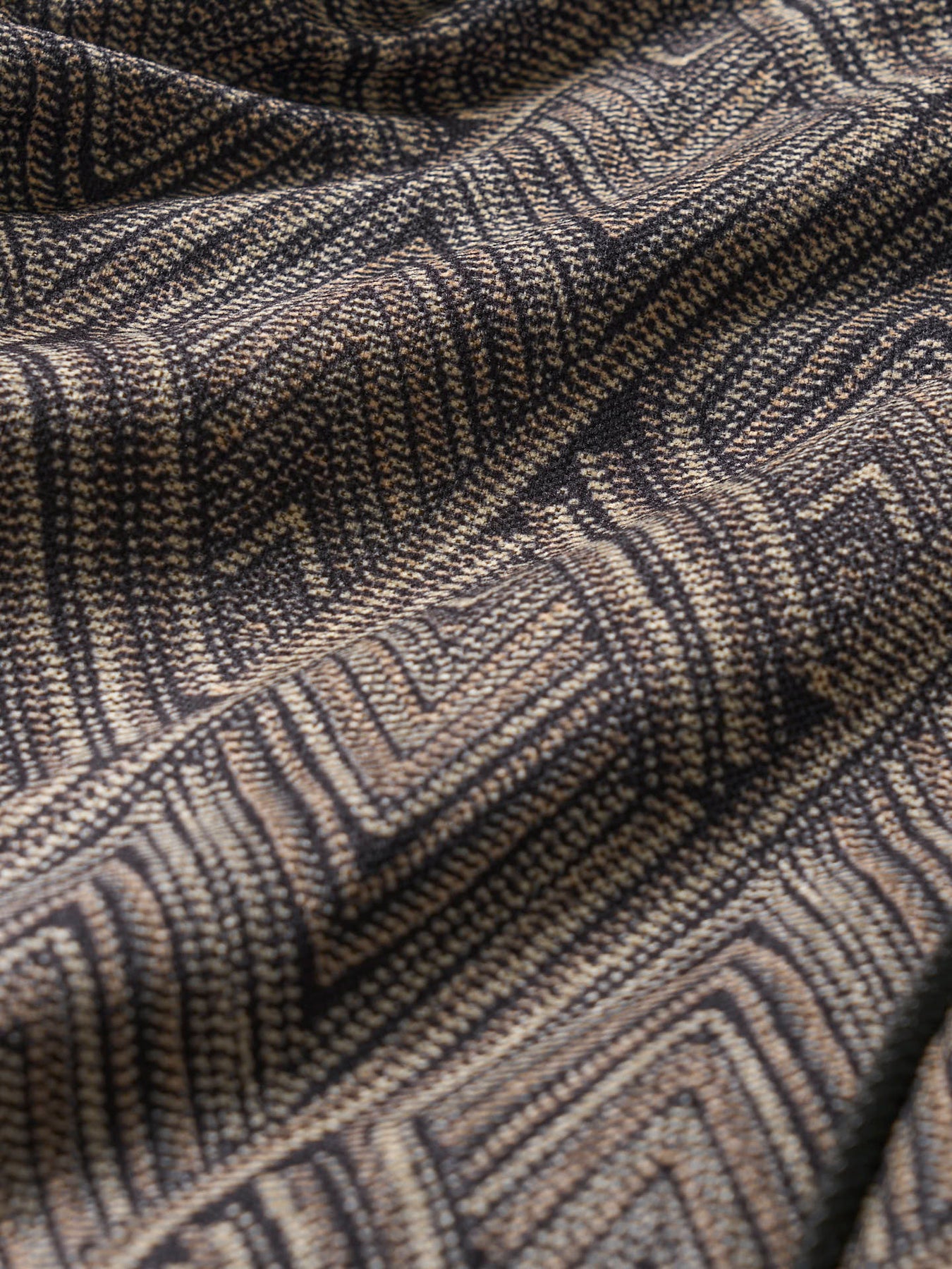 クラシックなヘリンボン柄がシンプルなトップスとの相性を高め、冬のスタイルに深みをプラス。