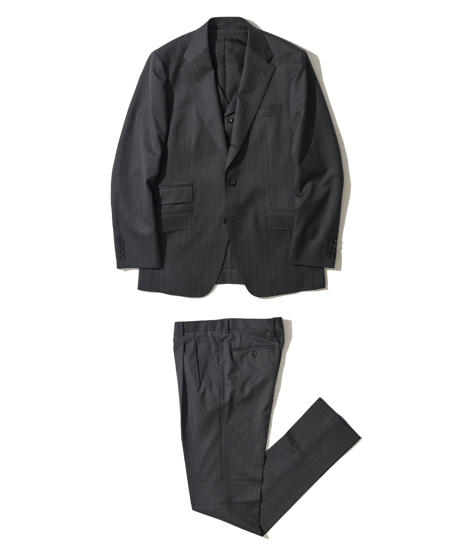 ジャケット×パンツに加え、ラペル付き10ボタンベストを組み合わせた3Pスーツは、Vゾーンを整え、視線を上へ導く設計。