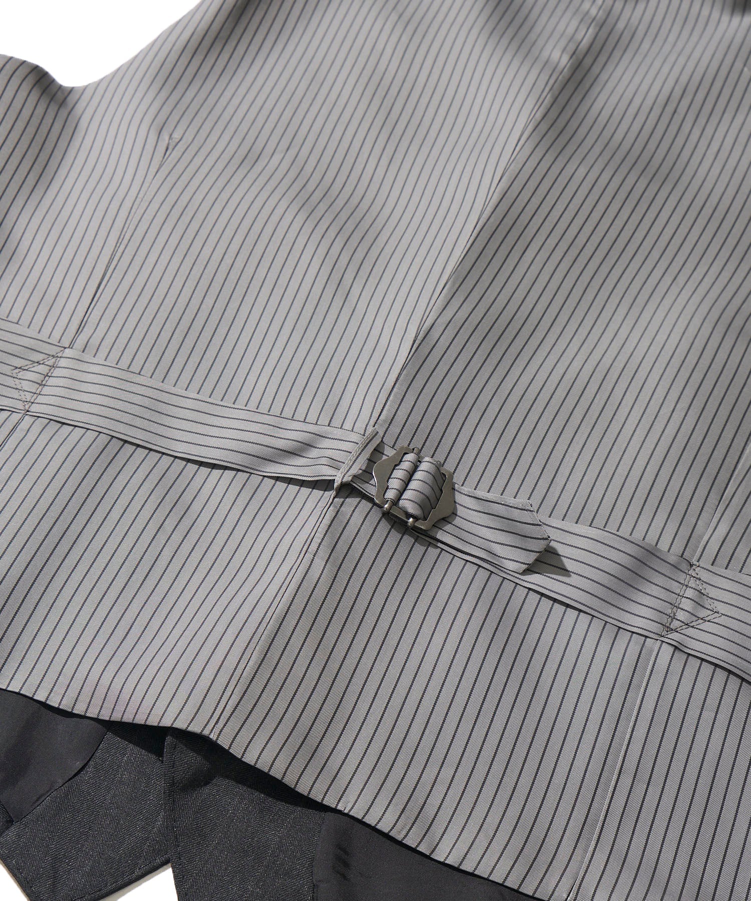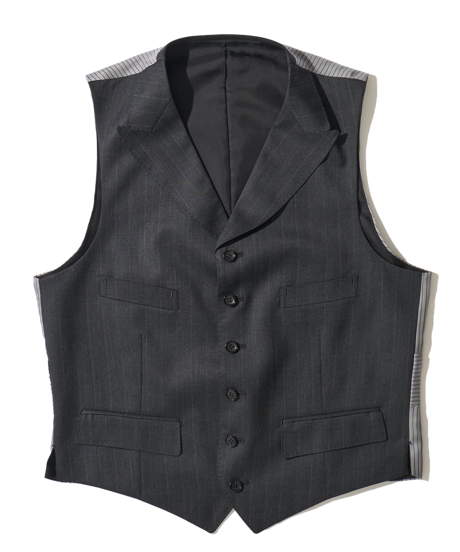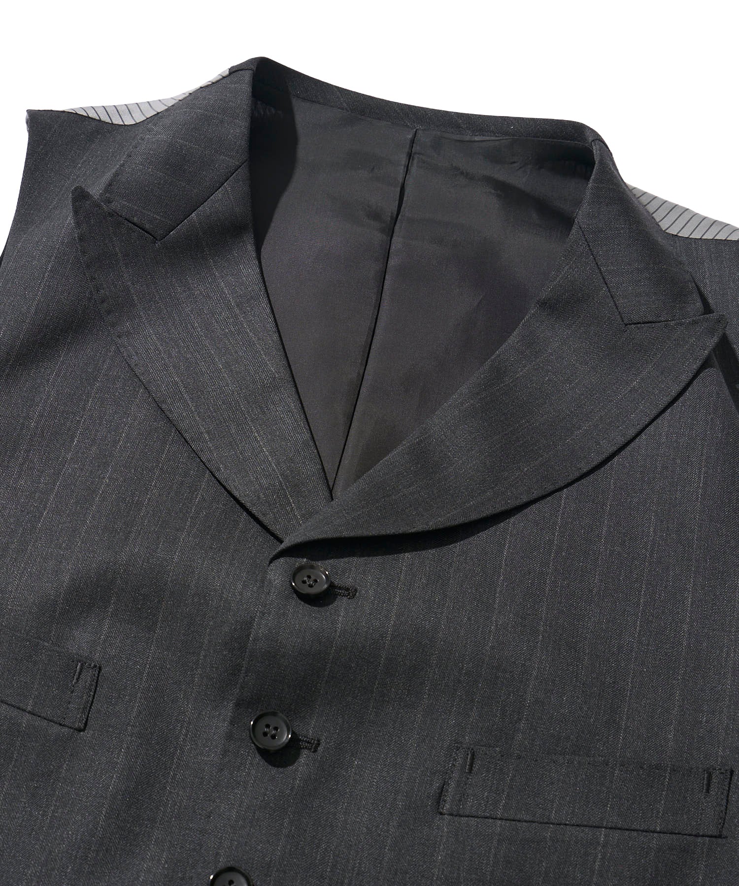 少し太めのチョークストライプが重厚さと80年代当時の空気が漂い、ベストの背面は生地・柄ともに当時同様のものを採用。