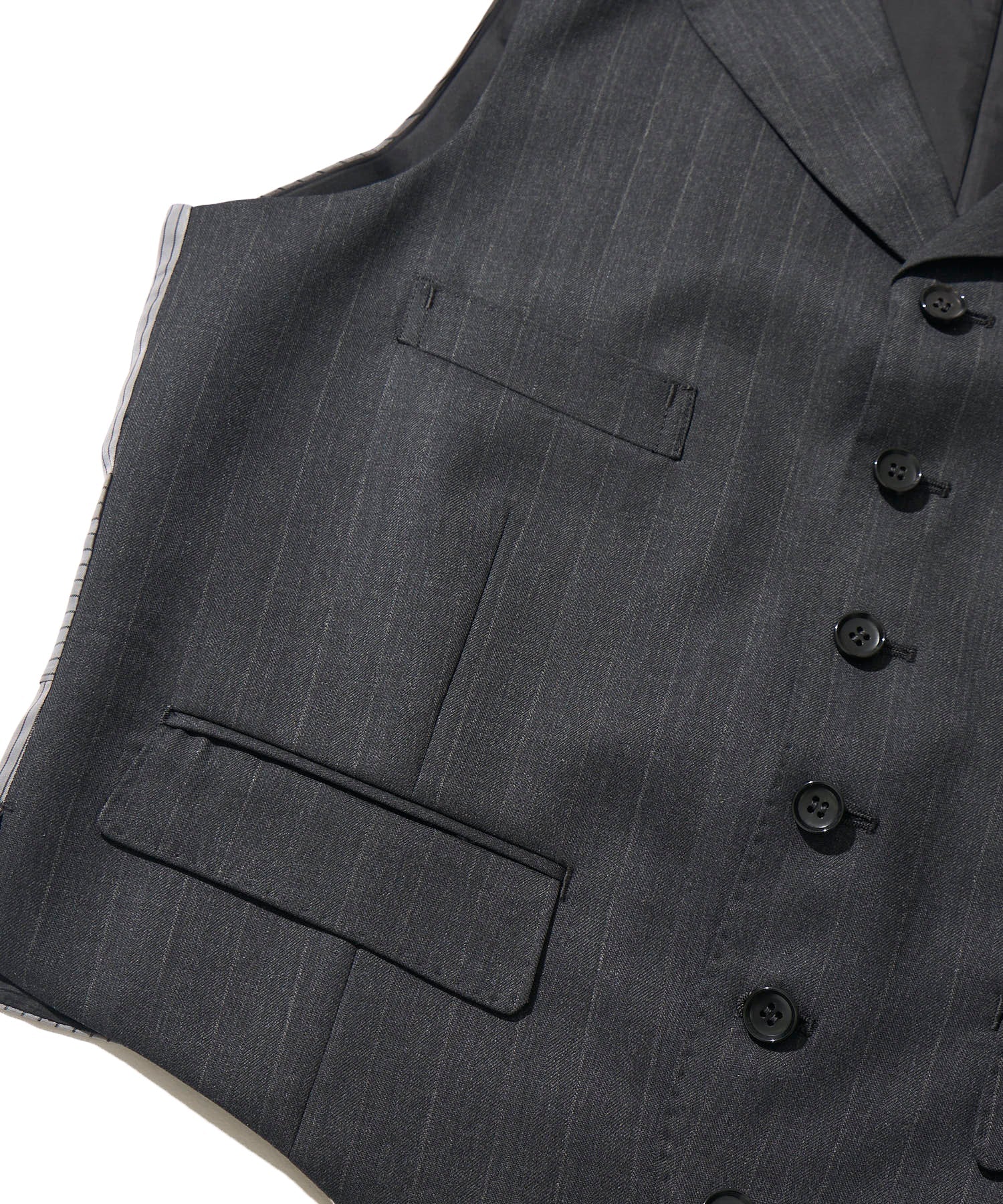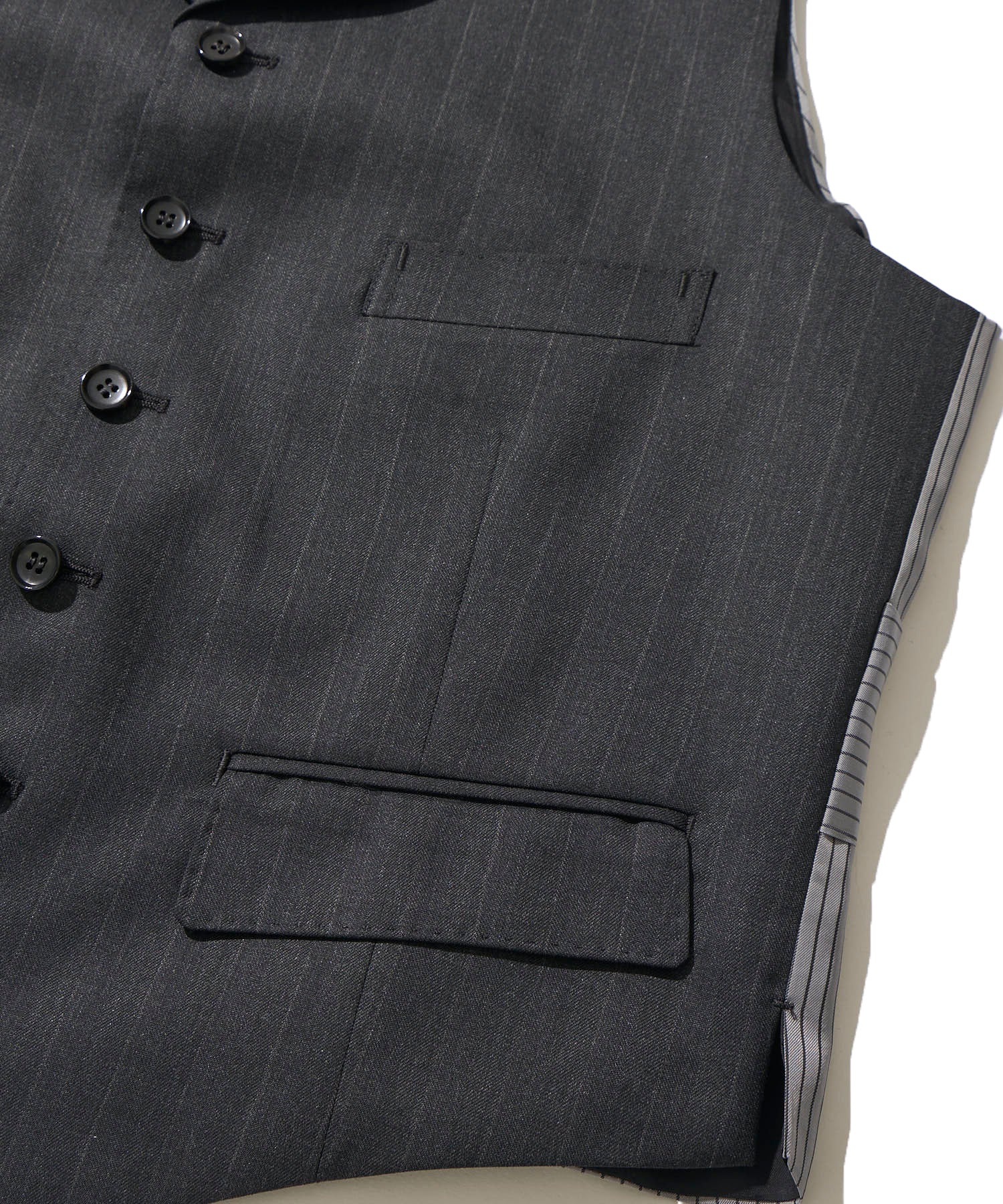 ・3Pスーツならではの完成度。当時から普遍的な魅力のあるラペル付きの10ボタンベスト