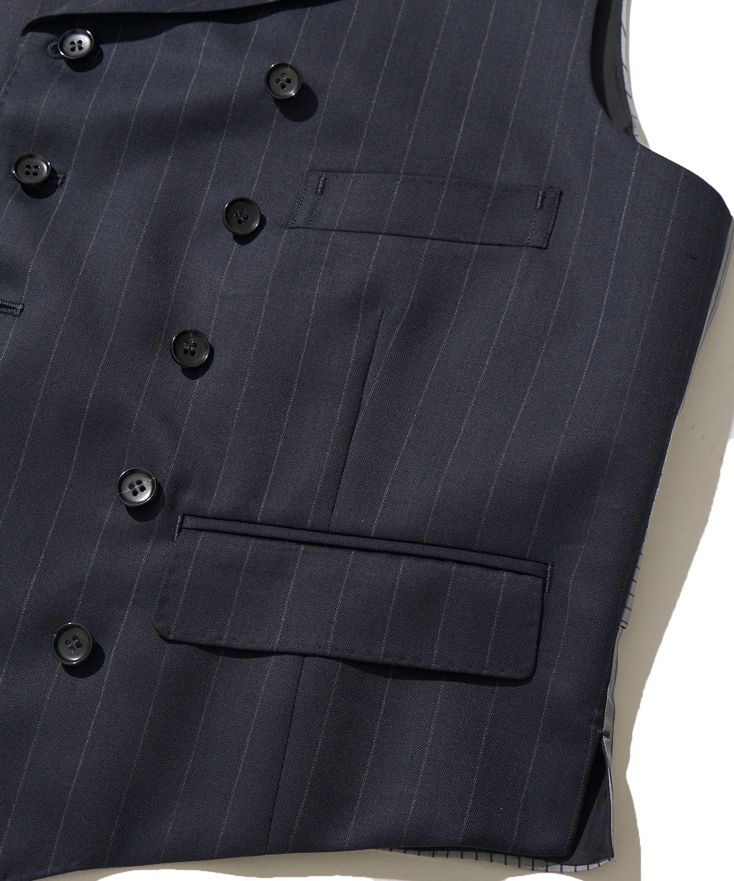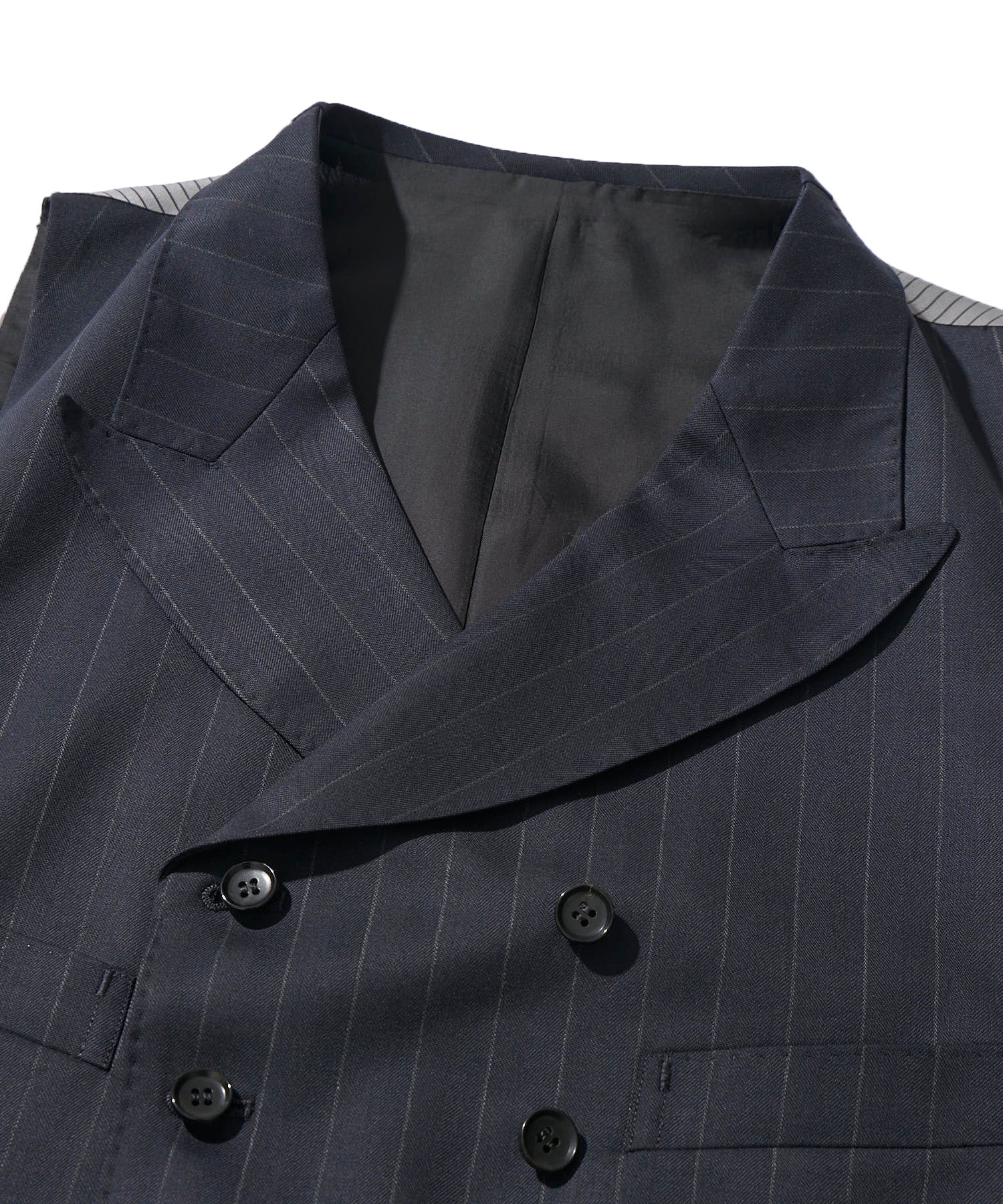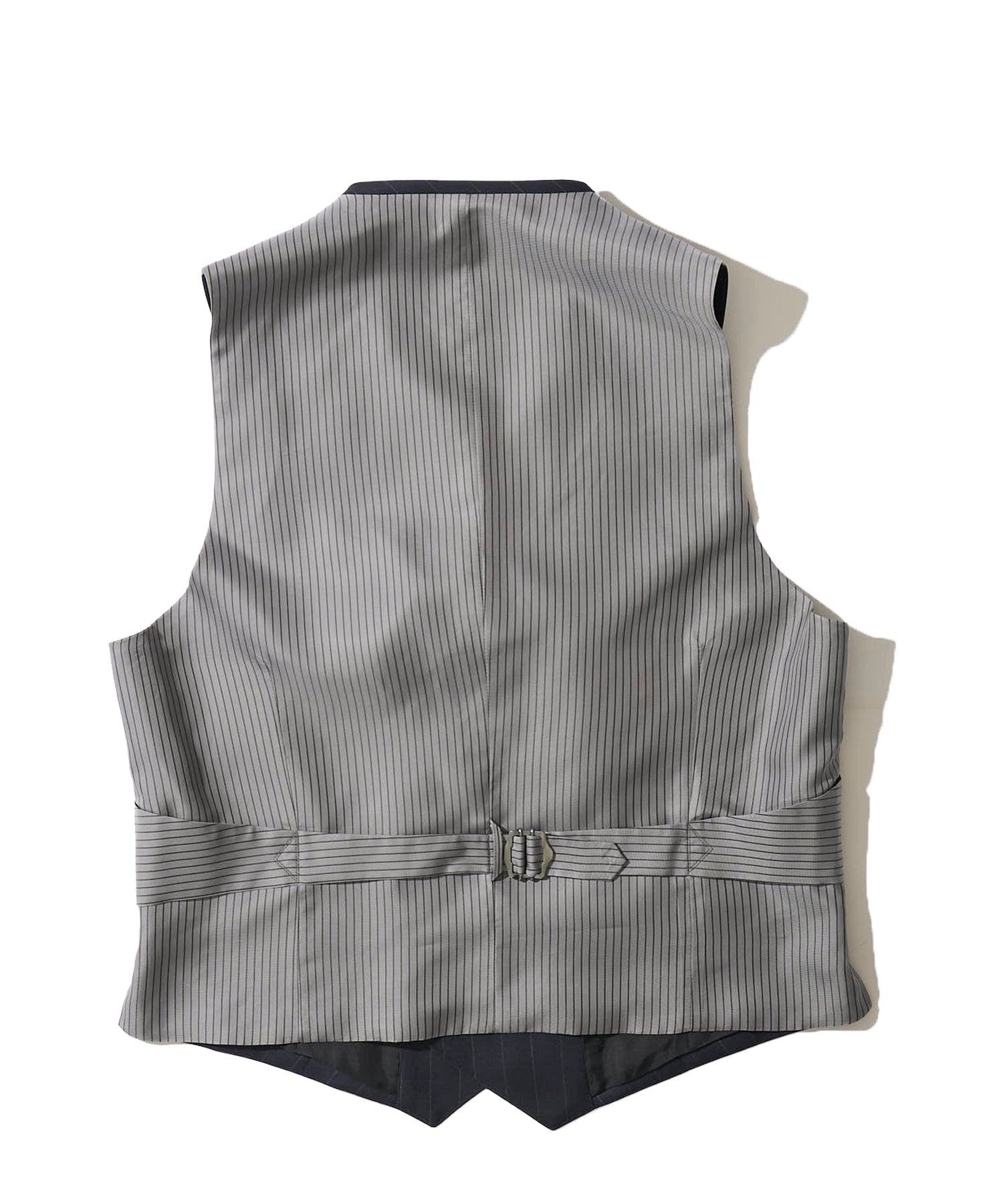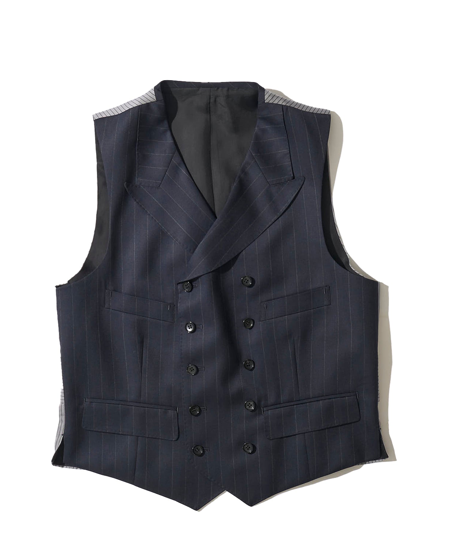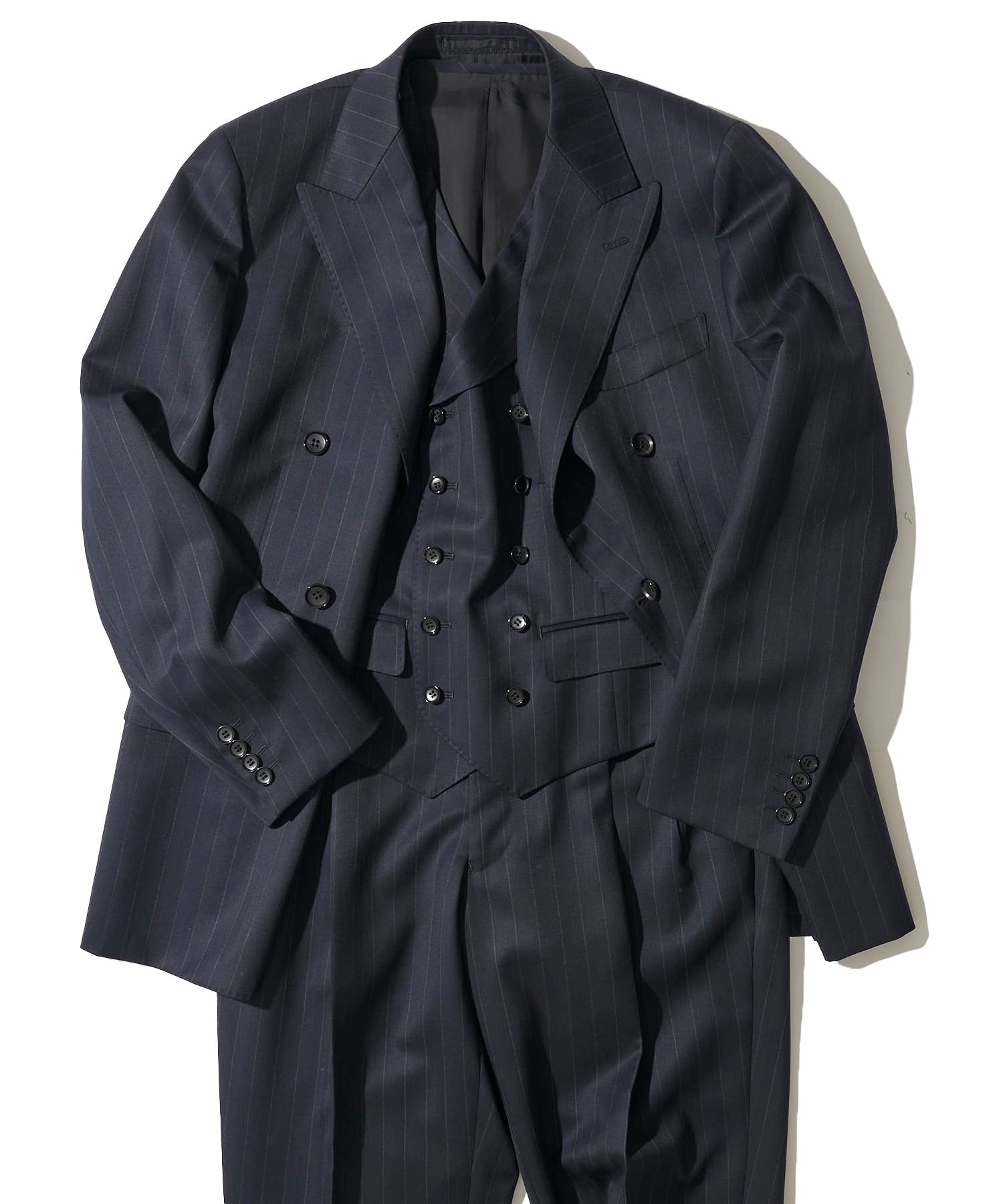 少し太めのチョークストライプが重厚さと80年代当時の空気が漂い、ベストの背面は生地・柄ともに当時同様のものを採用。