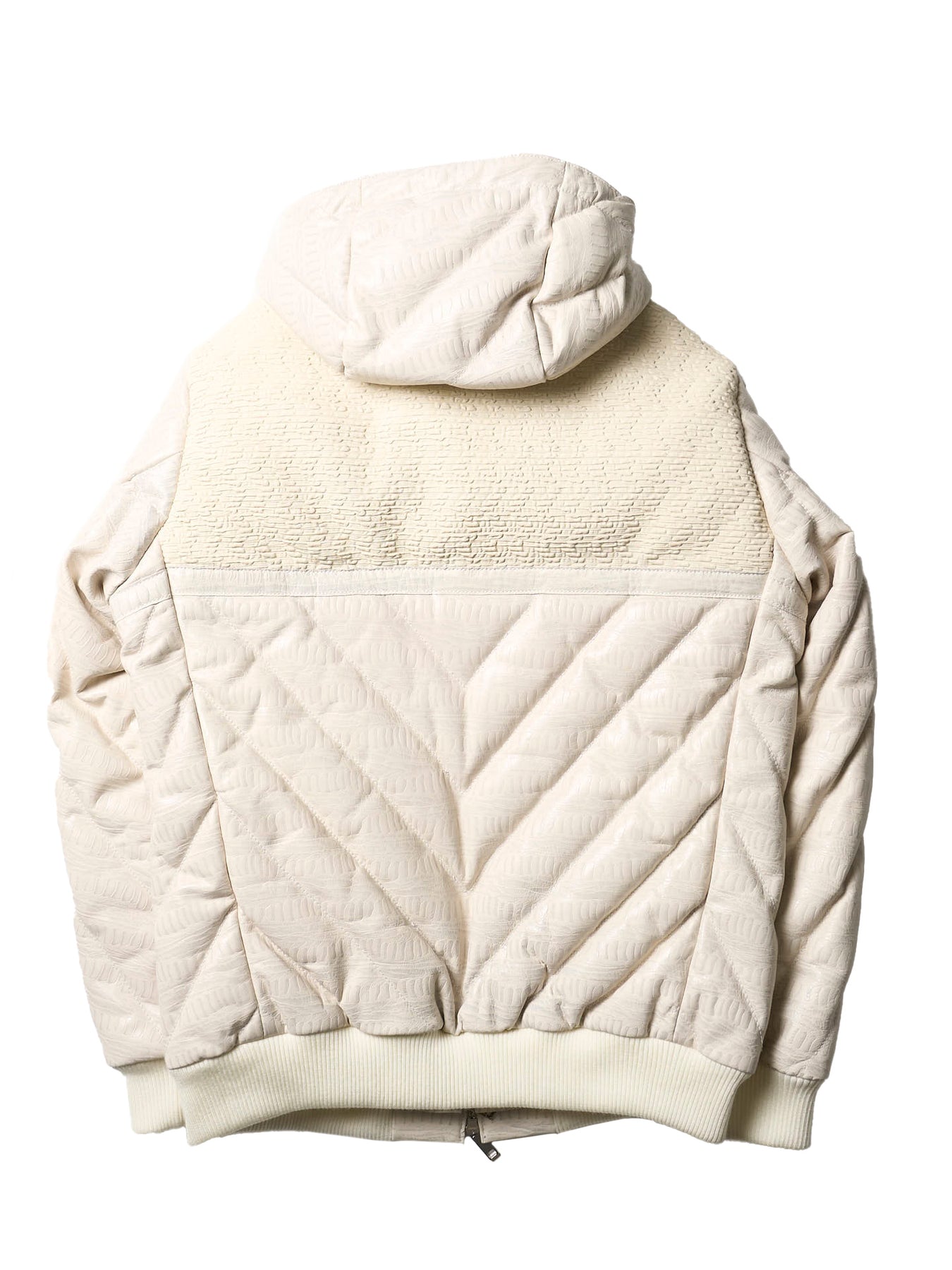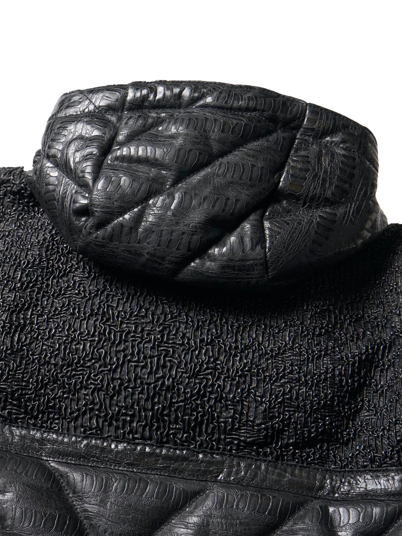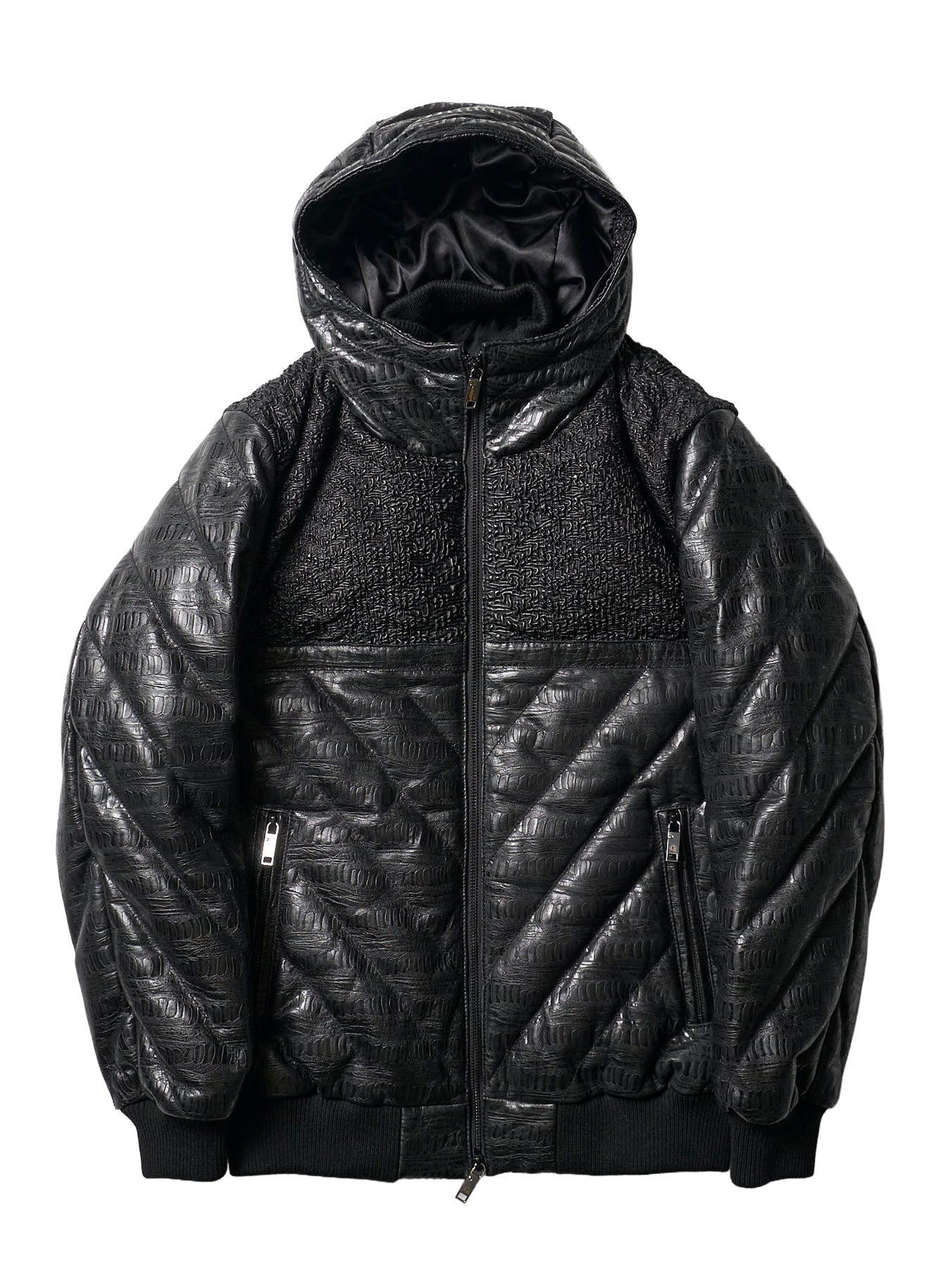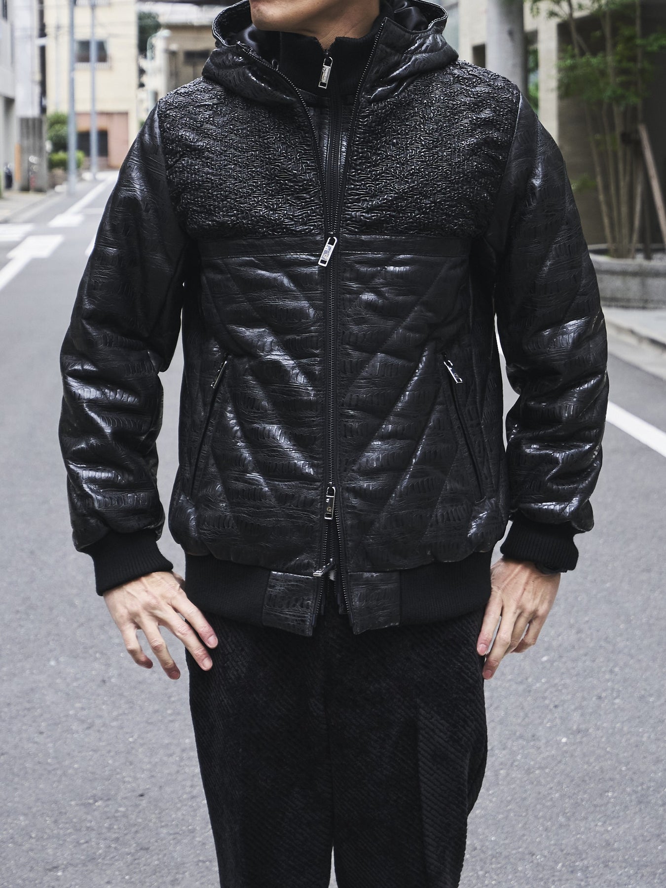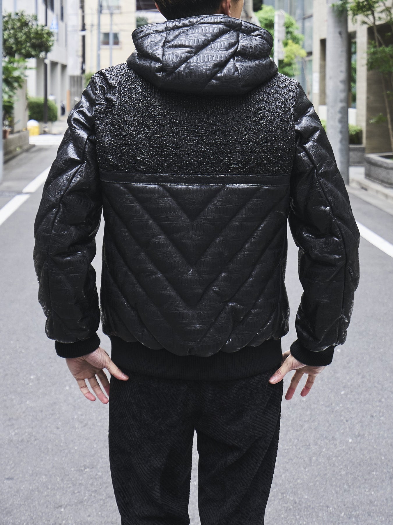 表地のレザーは柔らかく肌触りが良く、袖やフード、裾など細部までデザインと機能性にこだわっています。