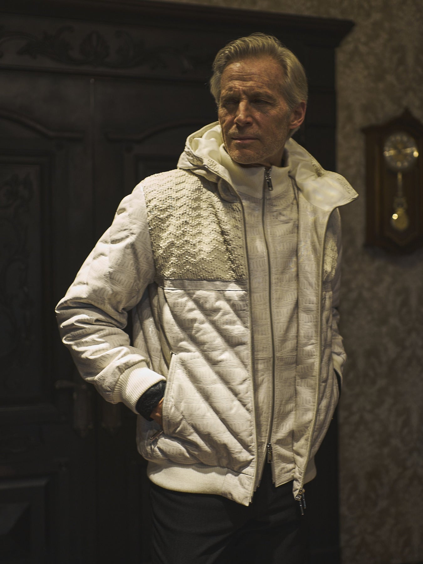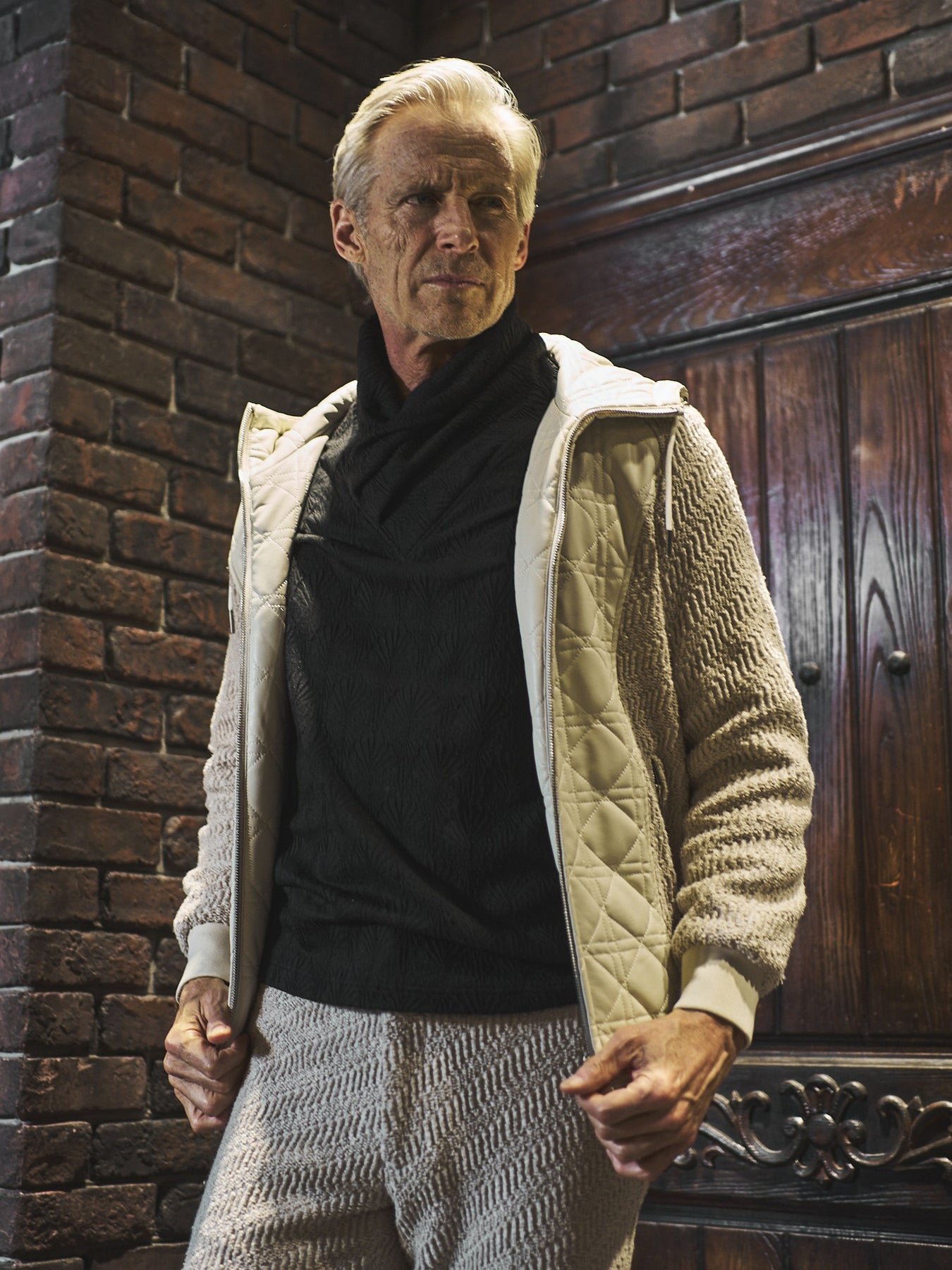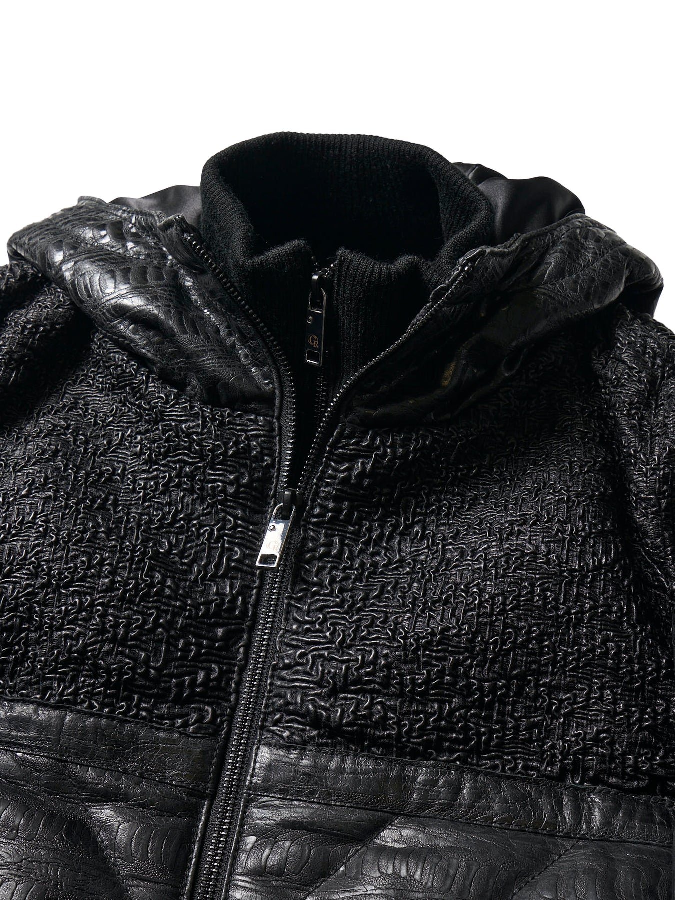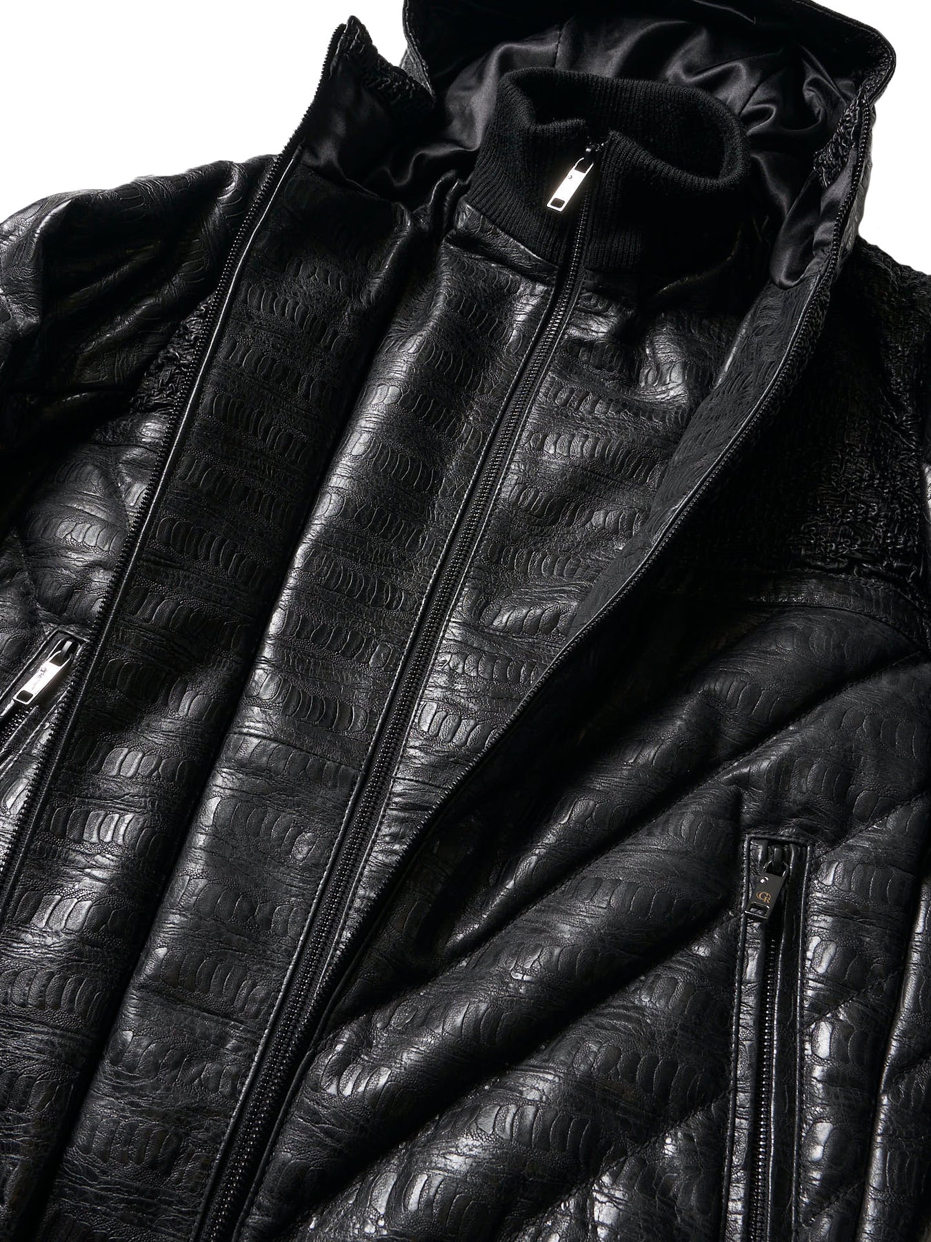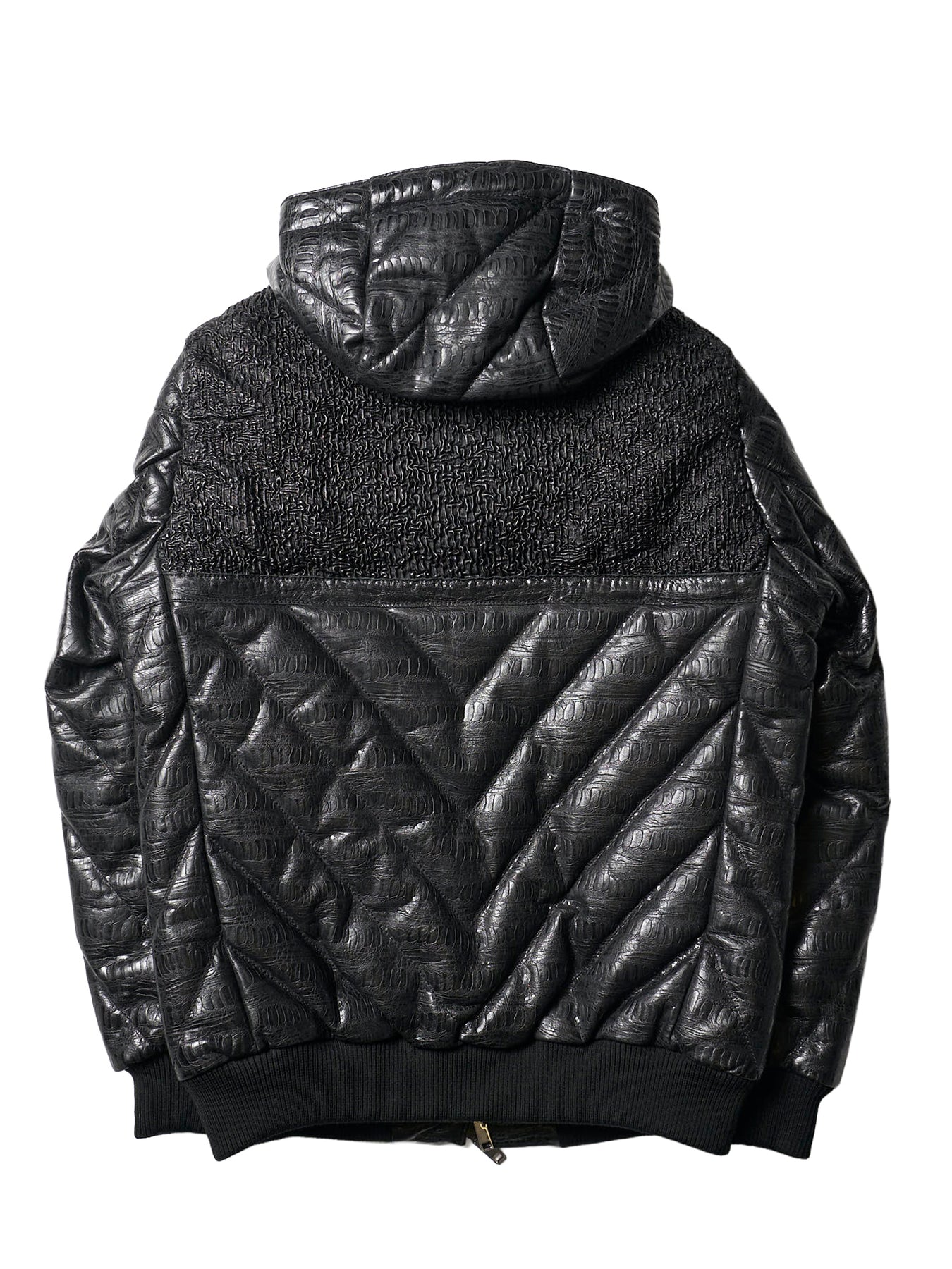 表地のレザーは柔らかく肌触りが良く、袖やフード、裾など細部までデザインと機能性にこだわっています。