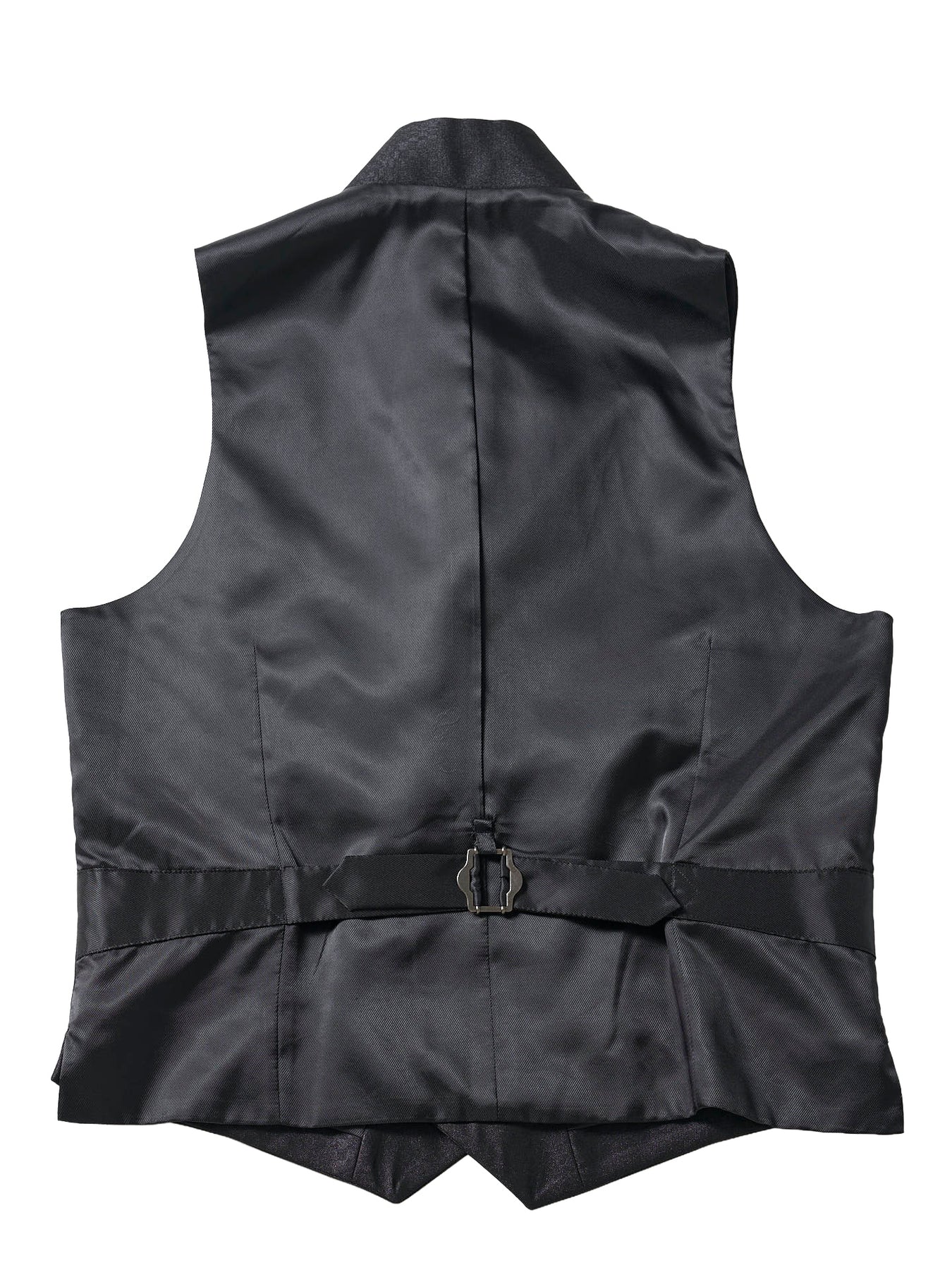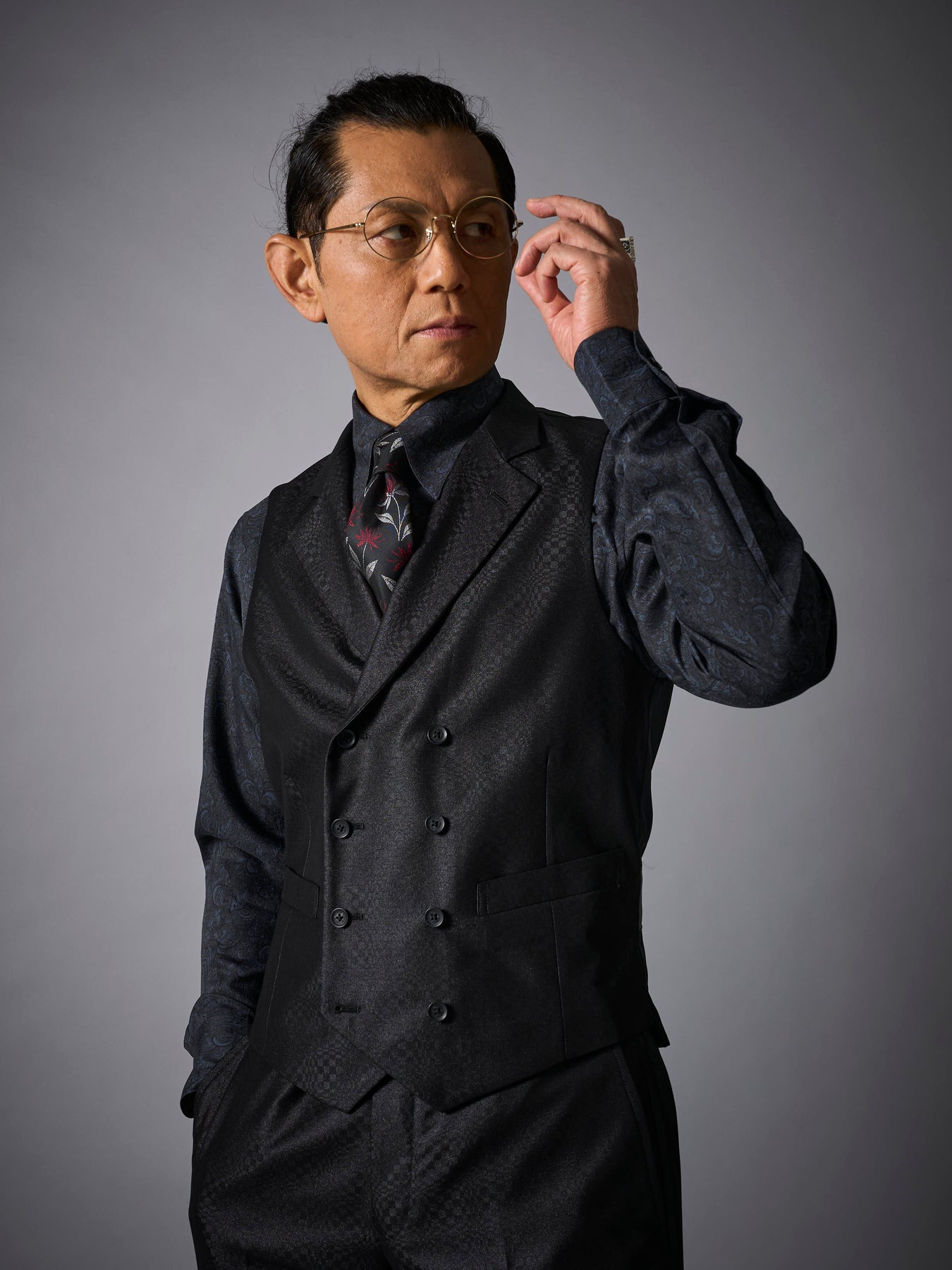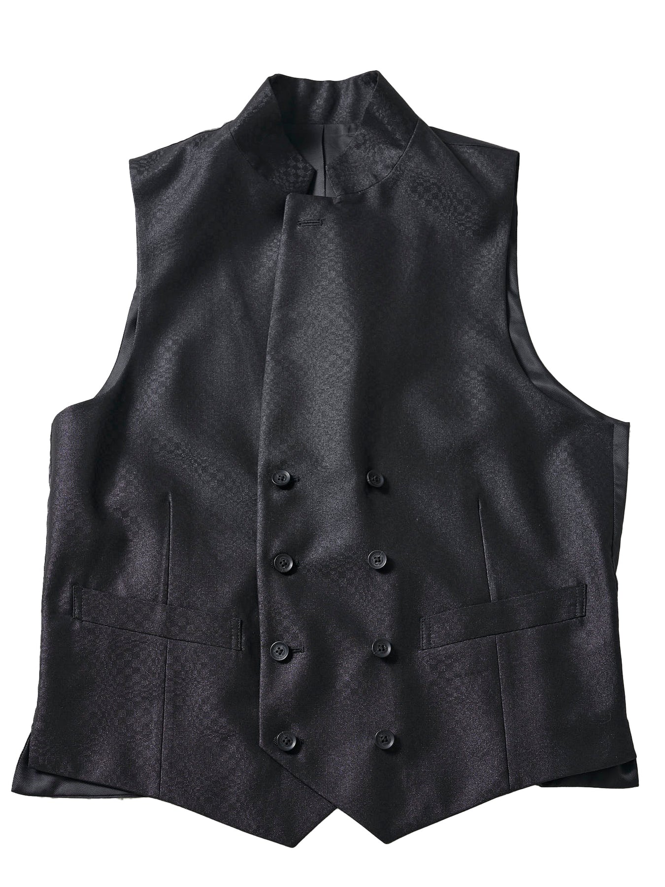 ベストには面白みのある襟付きダブルブレストデザインを採用。
