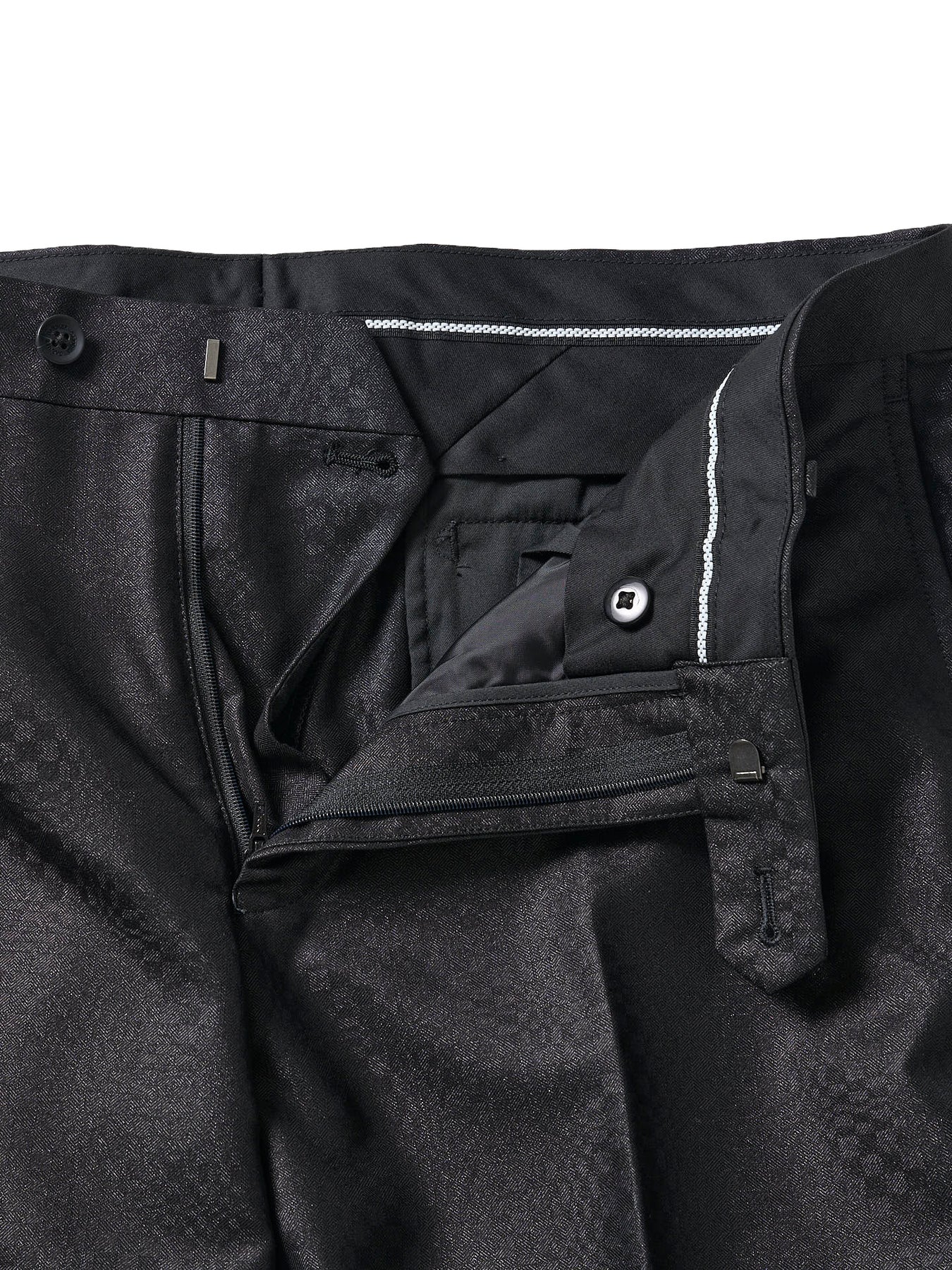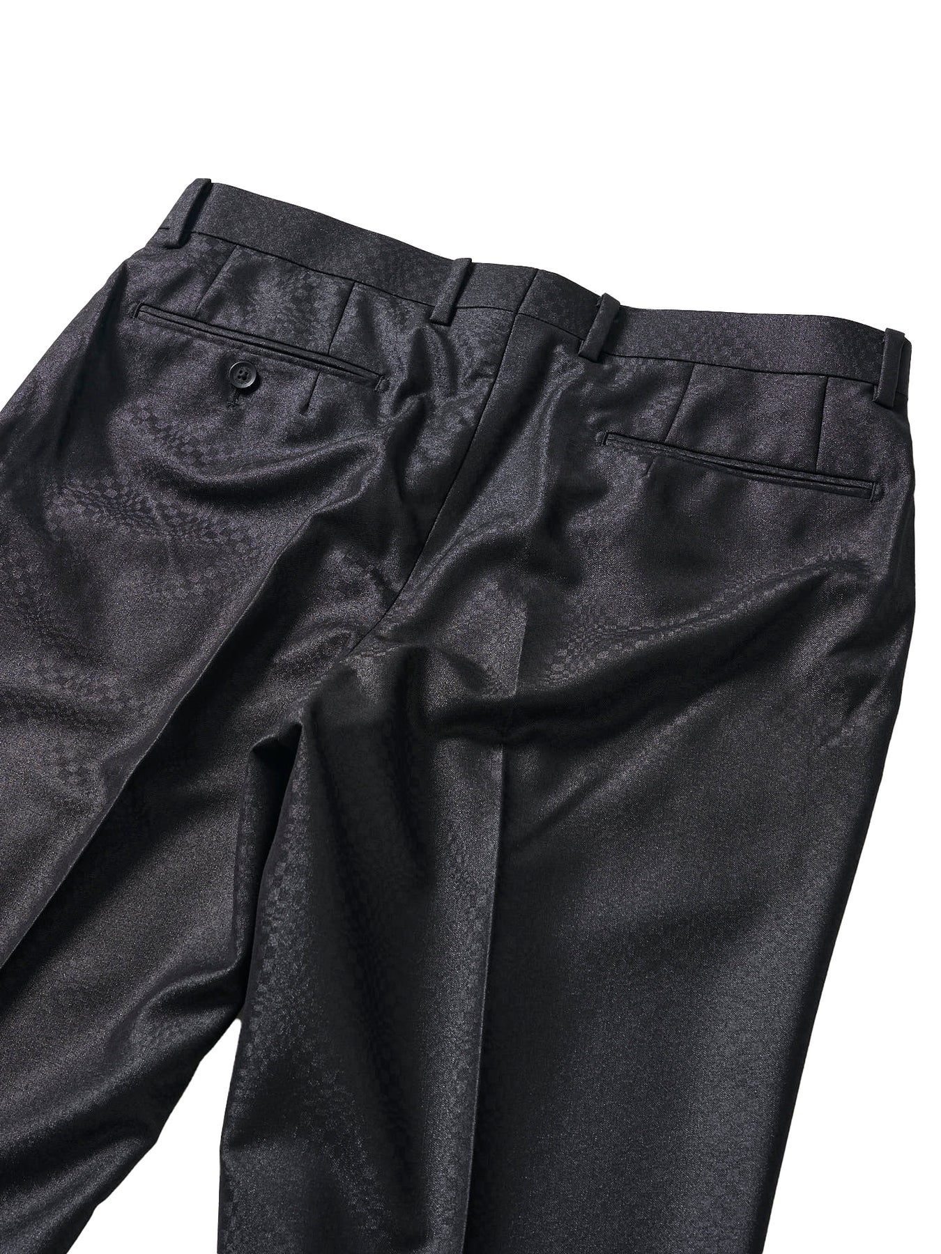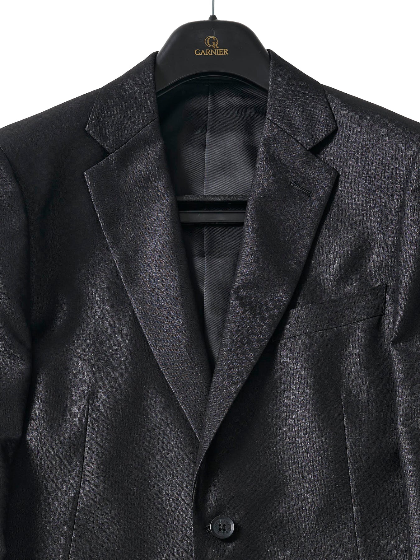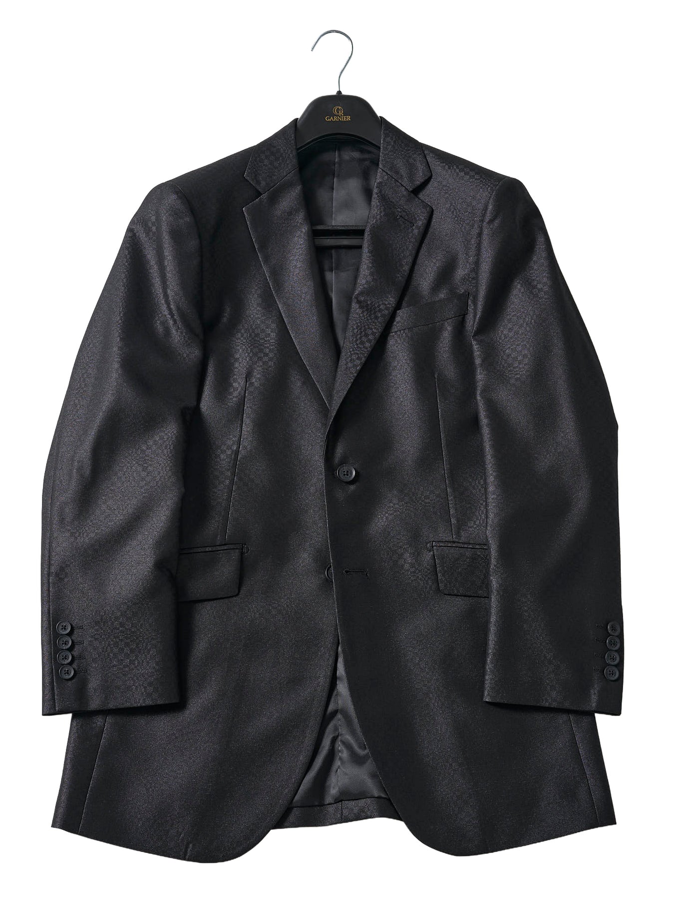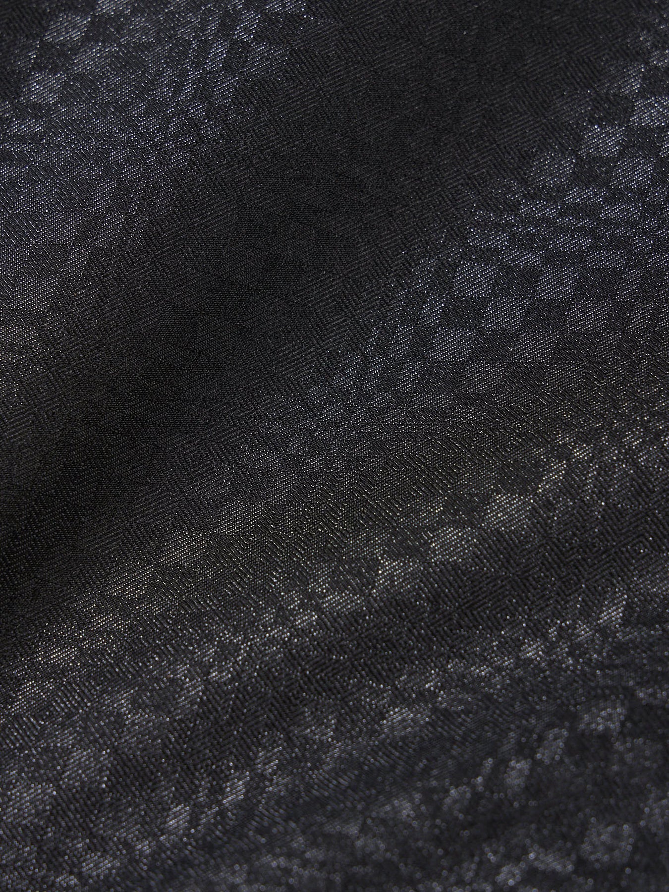 深みのあるブラックトーンに微細な光沢を添え、シックでありながら華やかさを感じさせる一着です。